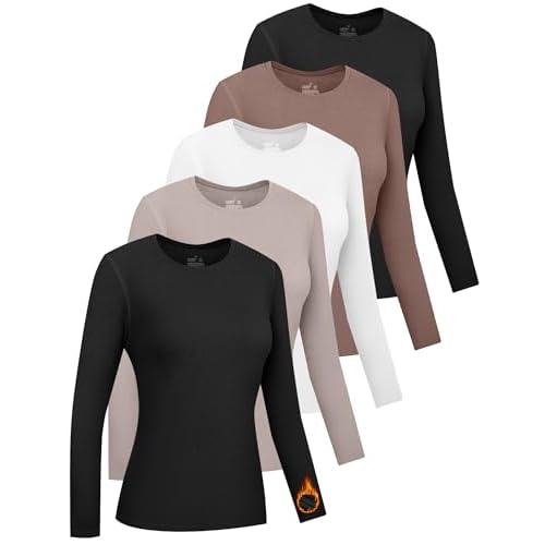 HOPLYNN 5 Pack Womens Long Sleeve Thermal Shirts Crew Neck Double Sided Fleece Lined Baselayer Tops for Cold Weather