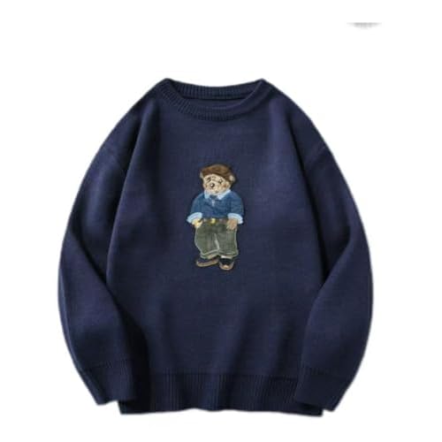 Teddy Bear Embroidered Sweater, Fleece Lined Crewneck Pullover, Warm Winter Knit, Navy Blue, Green, Black