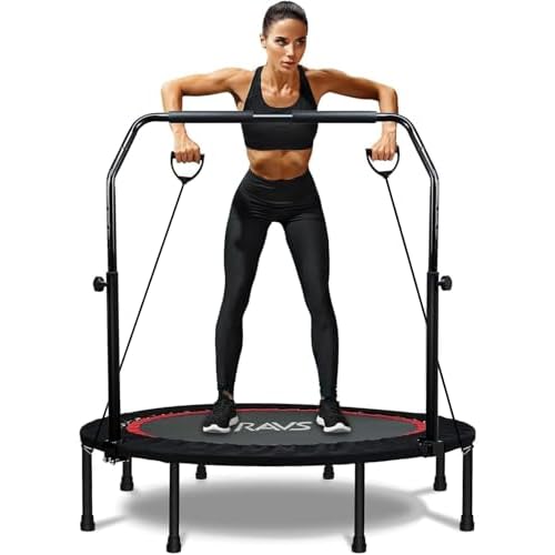 RAVS Mini Trampoline for Kids Adults 40″/48″ Foldable Fitness Rebounder Kids Trampoline with 5 Levels Height Adjustable Handle Resistance Bands Indoor Workout
