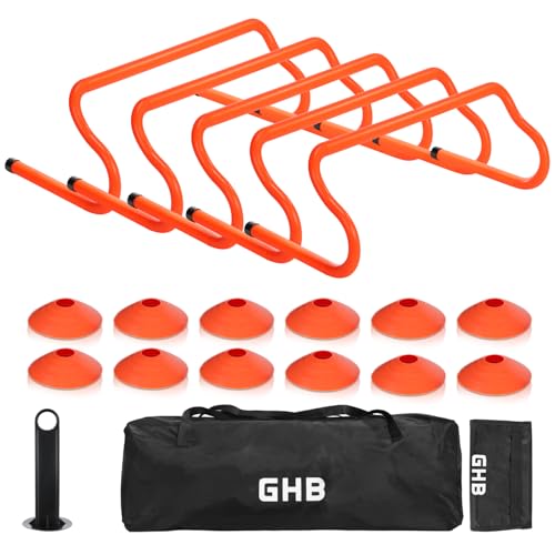 GHB Speed Agility Training Equipment, 5 Pack Agility Hurdles Soccer Cones 12 Pack Detachable Sturdy Hurdles Training Equipment Set with Carry Bag for Athletes,Soccer,Basketball